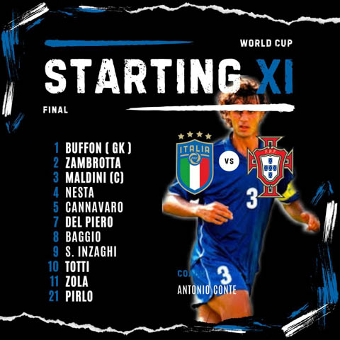 Buffon (1), Maldini (3), Nesta (4), Cannavaro (5), Zambrotta (2), Pirlo (21), Totti (10), Baggio (8), Del Piero (7), S Inzaghi (9), Zola (11)